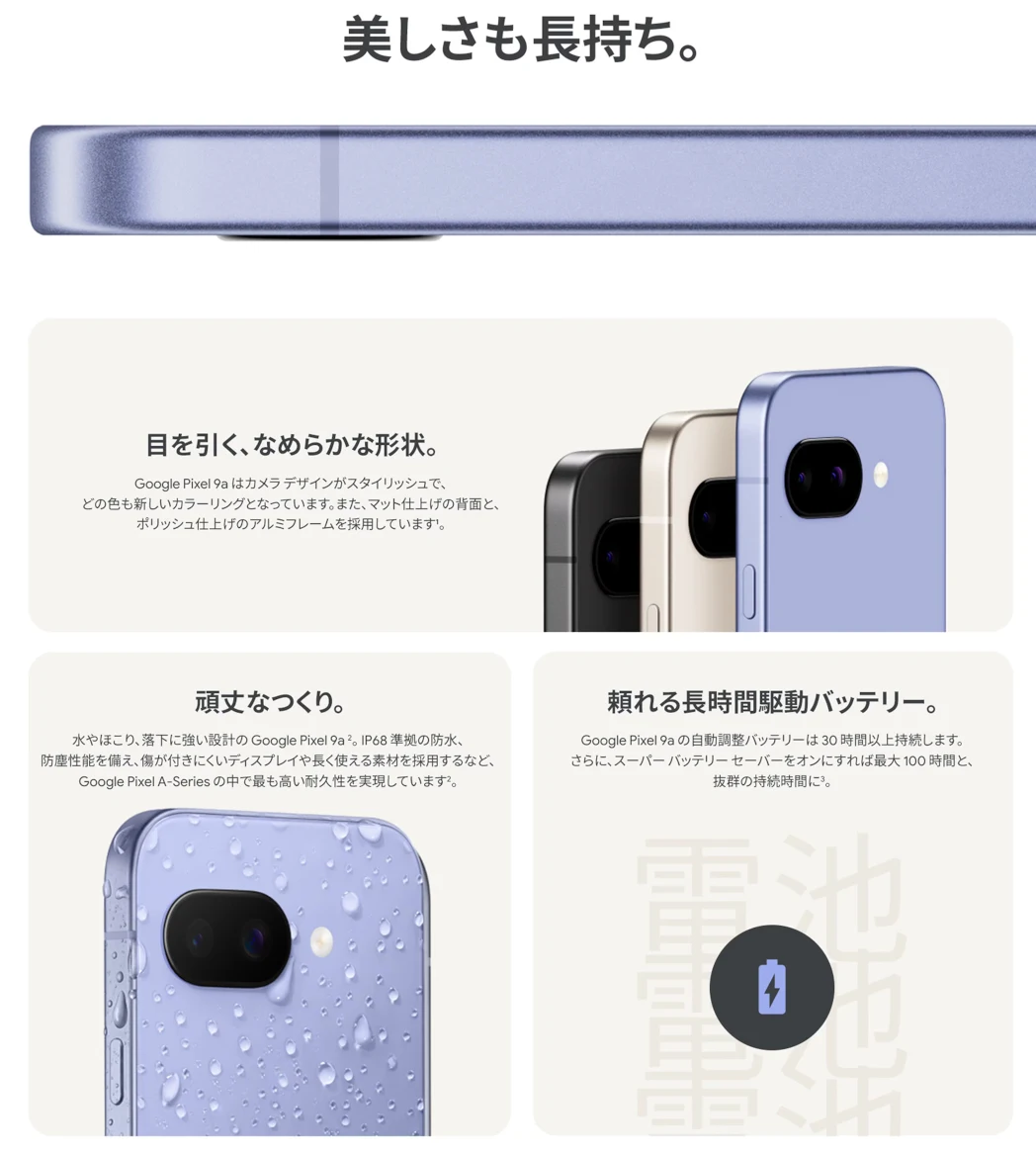 上位モデルと同じCPU「Google Tensor G4」搭載やリフレッシュレート120Hzでアスペクト比20:9のpOLEDディスプレイ、光学手振れ補正付デュアルカメラなどが特徴のモデルです。