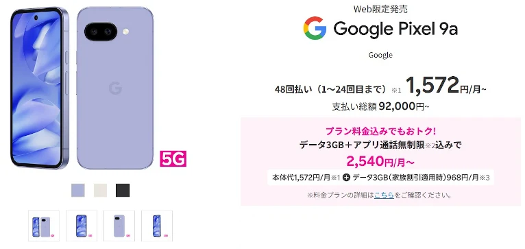 楽天モバイル 公式サイト(楽天モバイル Pixel 9a 製品ページ)