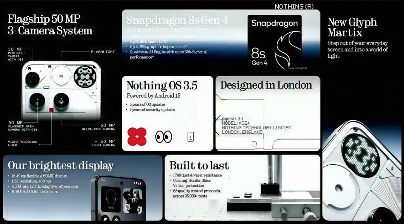 イギリスのコンシューマーテクノロジー企業Nothingは2025年7月2日、Snapdragon 8s Gen 4搭載のハイスペック5Gスマートフォン「Nothing Phone (3)」を発表しました。