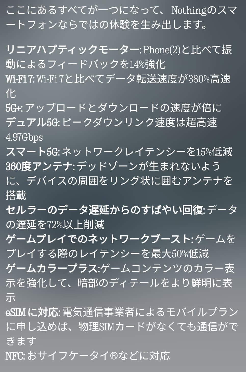その他 : デュアルSIM(NanoSIM/eSIM) , NFC , ステレオスピーカー , Glyphマトリックス