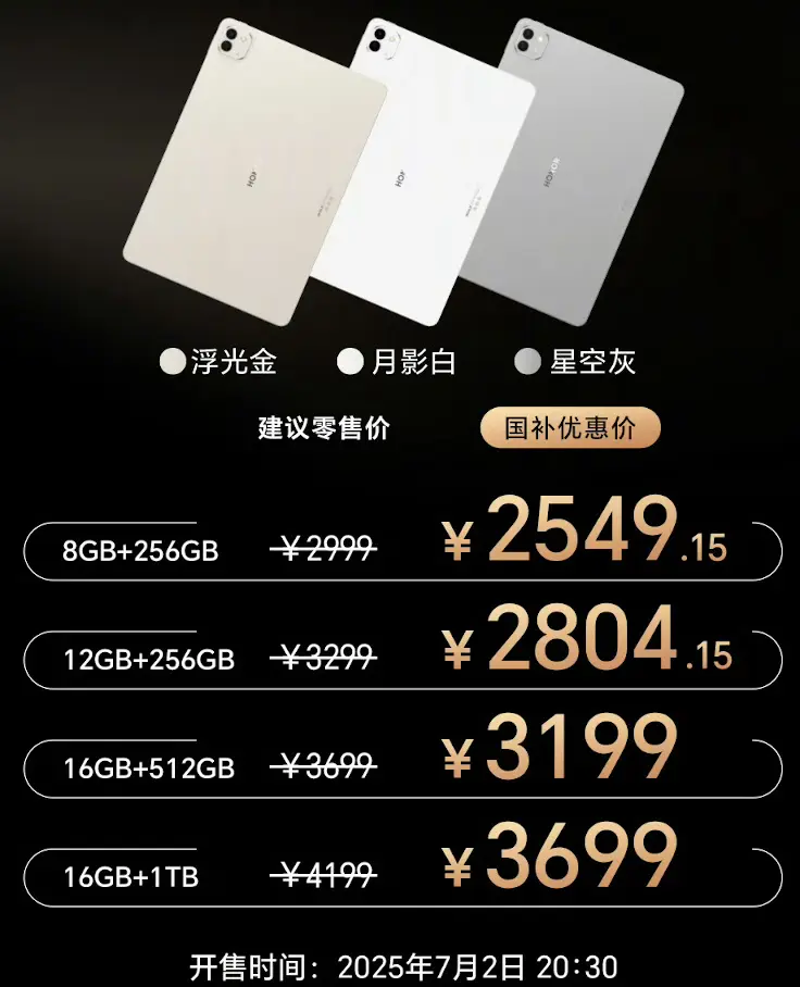 カラーはゴールド、ホワイト、グレーの3色。中国で2025年7月に発売、価格はRAM8GB/256GBモデルが2999CNY(約6.1万円)、RAM12GB/256GBモデルが3299CNY(約6.7万円)、RAM16GB/512GBモデルが3699CNY(約7.5万円)、RAM16GB/1TBモデルが4199CNY(約8.5万円)となっています。