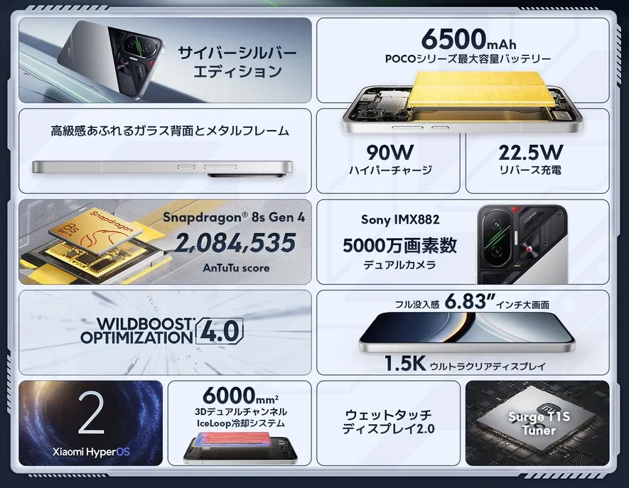 AnTuTuベンチ 約208万のSnapdragon 8s Gen 4採用や90W急速充電対応6500mAh大容量バッテリー、光学手振補正付き50MPカメラなどが特徴です。防水防塵(IP68)、OSはAndroid 15(Xiaomi HyperOS 2)、ハイレゾ、ステレオスピーカー、接続端子はUSB Type-C、イヤホン端子はなし、生体認証は指紋認証と顔認証に対応しています。