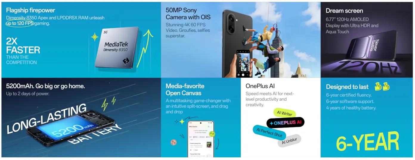 OnePlus Nord CE5は、Dimensity 8350 Apex搭載の5G対応ミッドハイクラス スマートフォン。6.77インチ120Hz AMOLEDやLYT-600採用OIS付き50MPデュアルカメラ、大容量バッテリー、OxygenOS 15などが特長。欧州やインドで2025年7月に発売、価格は299ユーロ(約5.2万円)から発売中です。