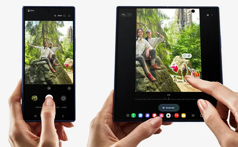 薄く、軽くなった「Samsung Galaxy Z Fold7」は、ユーザーがいつでもどこへでも持ち運びやすいよう設計されています。繰り返しの開閉やバッグに入れての持ち運びなど、日常使いを想定した高い耐久性を備えた設計となっており、長く安心してお使いいただけるよう、ヒンジ構造と折りたたみ型のディスプレイを大幅に刷新しています。