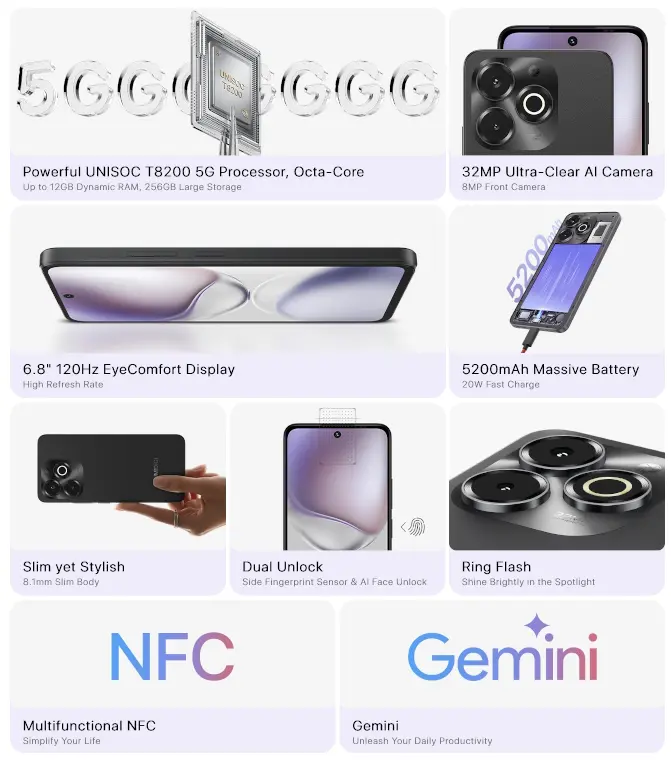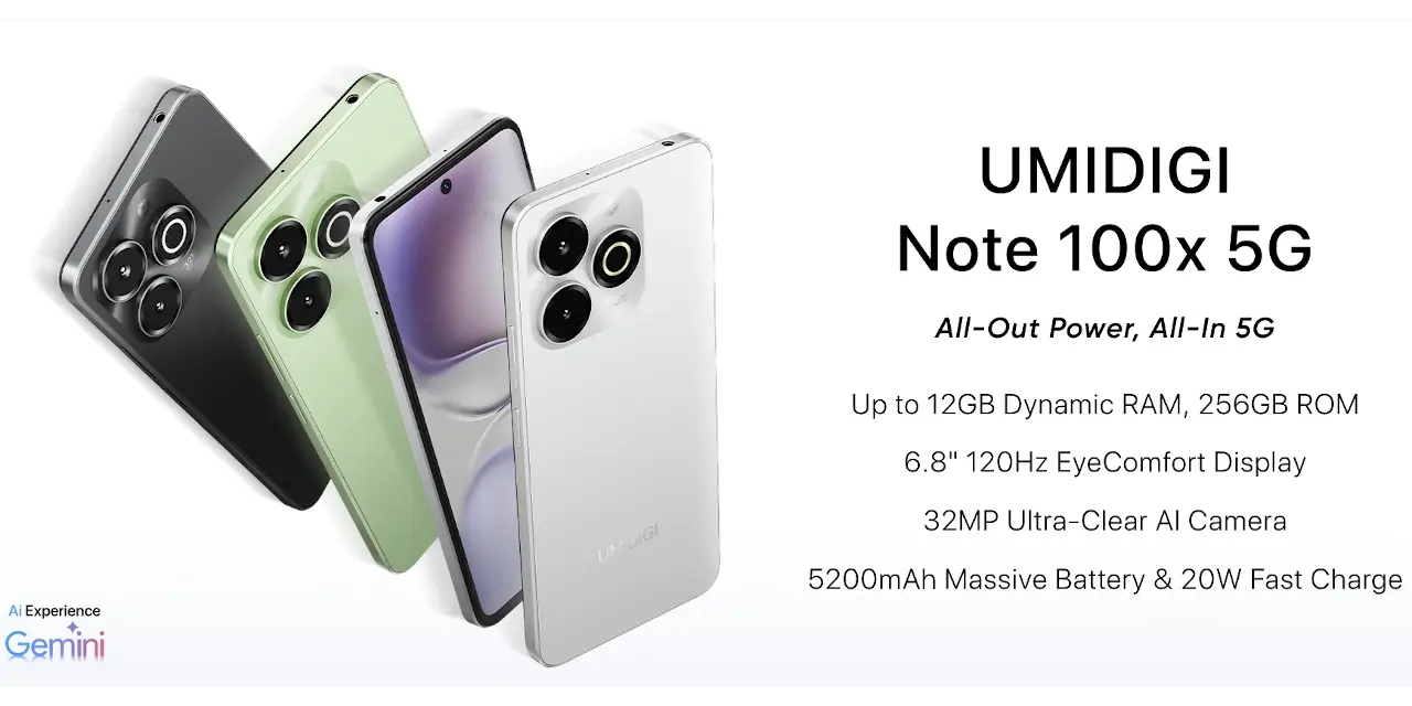 UMIDIGI Note 100x 5Gは、UNISOC T765 (T8200)を搭載した6.8インチ120Hz対応ディスプレイの5Gスマートフォン。32MPカメラや5200mAhバッテリー、防水(IP54)、Android 15などの機能を備えたモデルで、中華ECサイトにて発売予定。