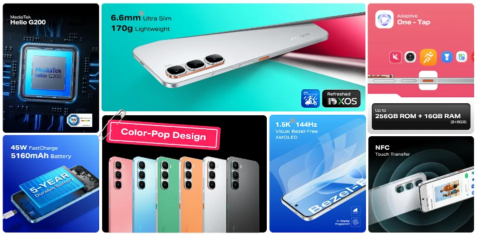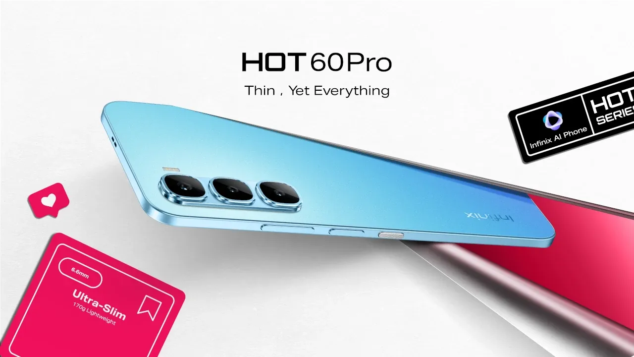 Infinix HOT 60 Pro は、144Hz駆動の6.78インチAMOLEDディスプレイやMediaTek Helio G200を搭載した4Gスマートフォン。軽量薄型で、5160mAhバッテリー(45W充電)や防水防塵(IP64)にも対応。OSはAndroid 15。カラーは6色展開で、2025年7月よりアフリカなどで発売予定。