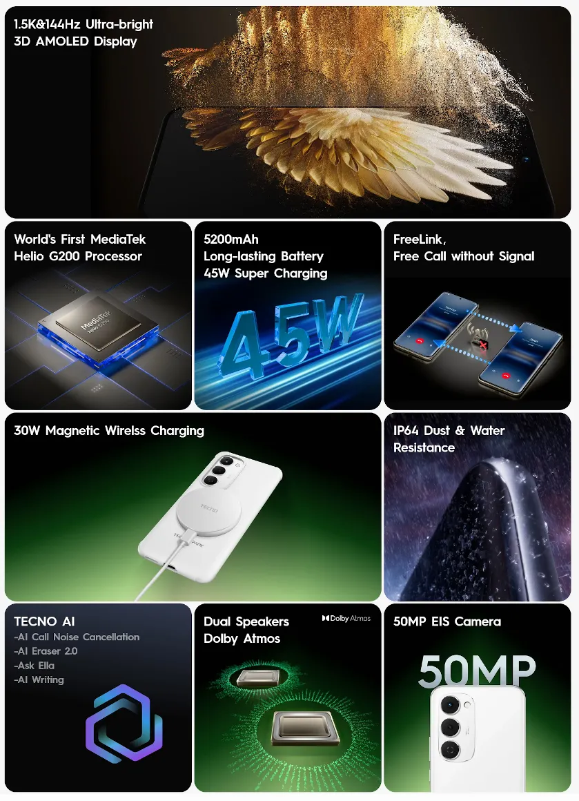TECNO SPARK 40 Pro+は、144Hz対応の6.78インチAMOLEDディスプレイやHelio G200搭載、45W急速&30Wワイヤレス充電に対応した5200mAhバッテリーを備えたミッドロークラスの4Gスマートフォン。OSはAndroid 15、顔認証と指紋認証対応。アフリカ地域などで2025年7月発売。