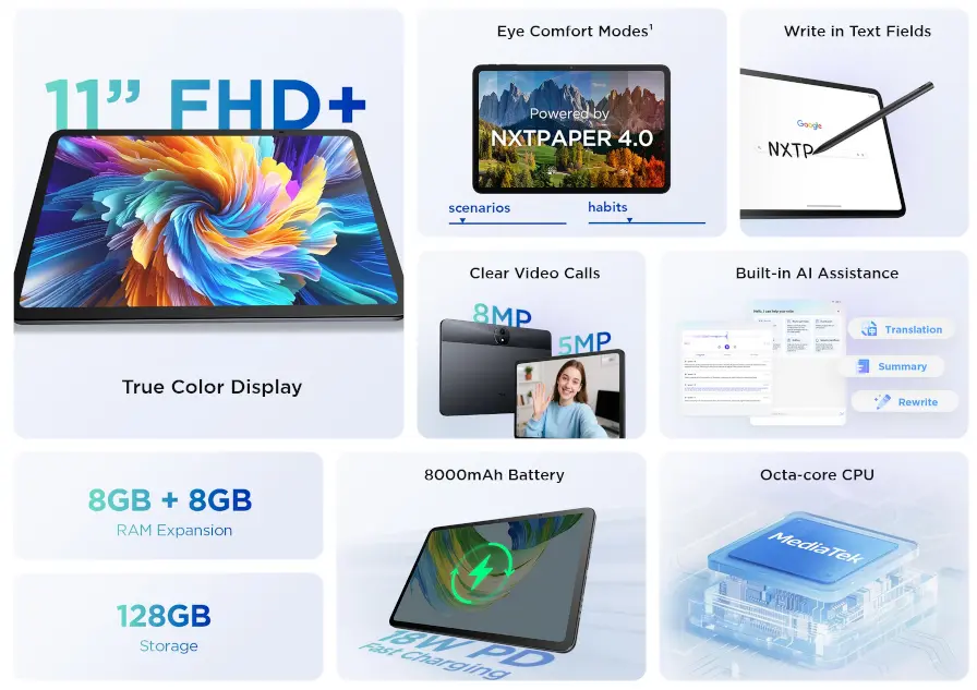 TCL NXTPAPER 11 Gen 2 は、11インチWUXGA(1920×1200)ディスプレイ、CPUは: MediaTek Helio G80 MT8786 2.0GHz オクタコア、RAM8GB、ストレージ容量は128GB、メインカメラは800万画素カメラ搭載のエントリークラスのアンドロイドタブレットです。