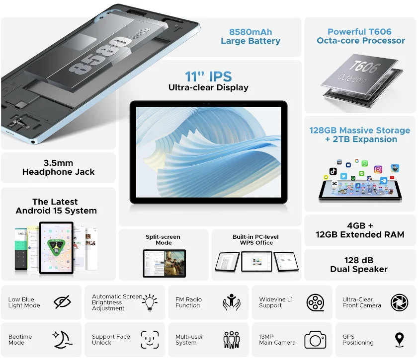 DOOGEE U11は、UNISOC T606搭載の11インチAndroidタブレット。90Hzリフレッシュレート対応ディスプレイやデュアルスピーカー、8580mAhの大容量バッテリーを備えたエントリー向けモデルで、OSはAndroid 15/16を採用。顔認証に対応。