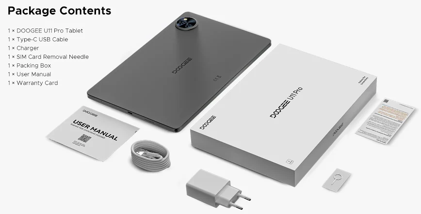 DOOGEE U11 Pro は、11インチWXGA(1280×800)のディスプレイ、CPUにUNISOC T7200 1.6Ghz オクタコア(T606)、RAM6GB、ストレージ容量は256GB、メインカメラは1300万画素カメラ搭載のエントリークラスのアンドロイドタブレットとなっています。