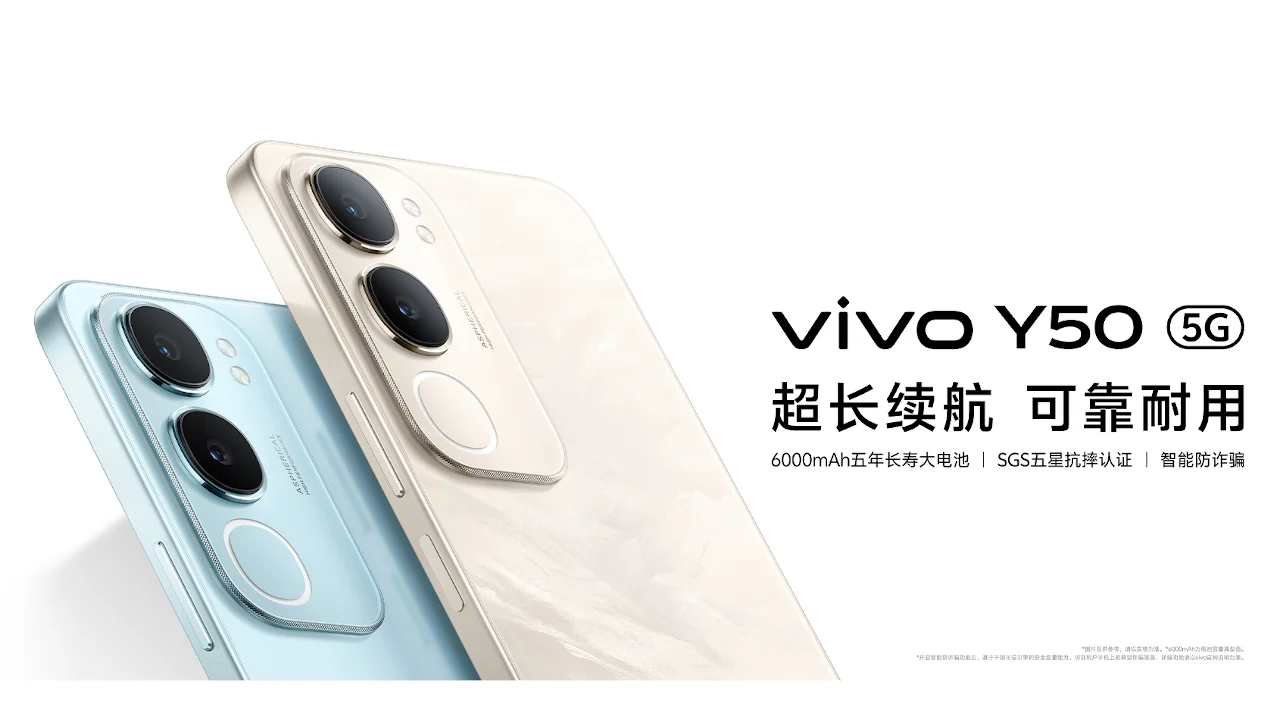 6000mAh大容量バッテリー搭載や防水防塵耐衝撃(IP64)などが特徴です。OSはAndroid 15 (OriginOS 5)、接続端子はUSB Type-C、イヤホン端子はあり、生体認証は指紋認証センサー(サイド)と顔認証に対応しています。2020年に発売した同名のvivo Y50とは別モデルです。