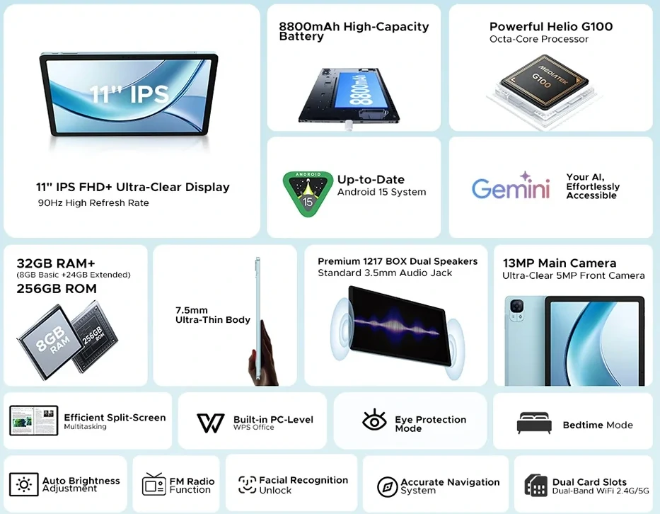 DOOGEE Tab E3は、11インチディスプレイやHelio G100、8GB RAM、256GBストレージを搭載したミッドレンジAndroidタブレット。8800mAhバッテリーやクアッドスピーカー、4G LTE通信対応、顔認証などを備えたモデルです。