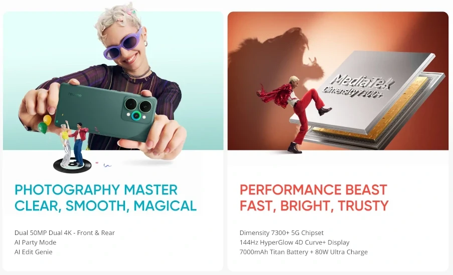 realme 15 5Gがインドで発表。Dimensity 7300+や144Hz AMOLED、OIS付き5000万画素カメラ、7000mAhバッテリーなどを搭載したミッドレンジ機、価格は25,999INR(約4.5万円)から。