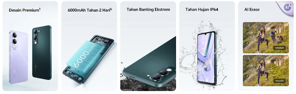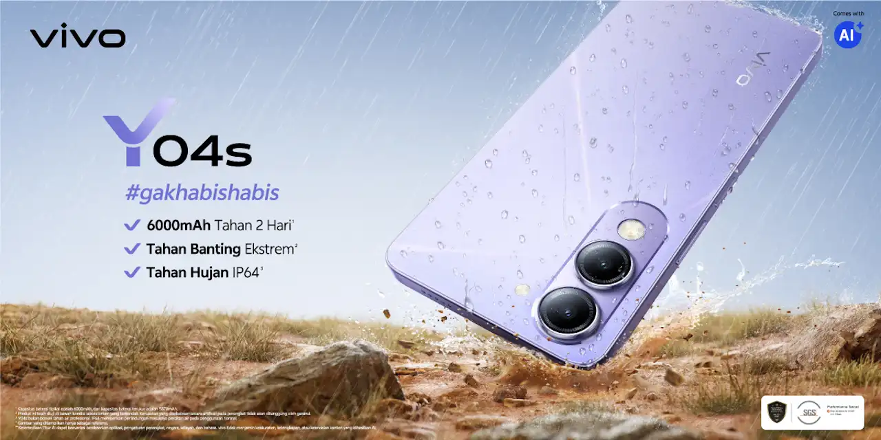 vivo Y04s をインドネシアで発表。6.74インチ90Hz液晶や6000mAhの大容量バッテリーを備え、IP64の防水防塵にも対応。Androidを搭載し、指紋・顔認証やデュアルカメラも装備。インドネシアでの価格は1,399,000IDR(約1.3万円)で発売されています。