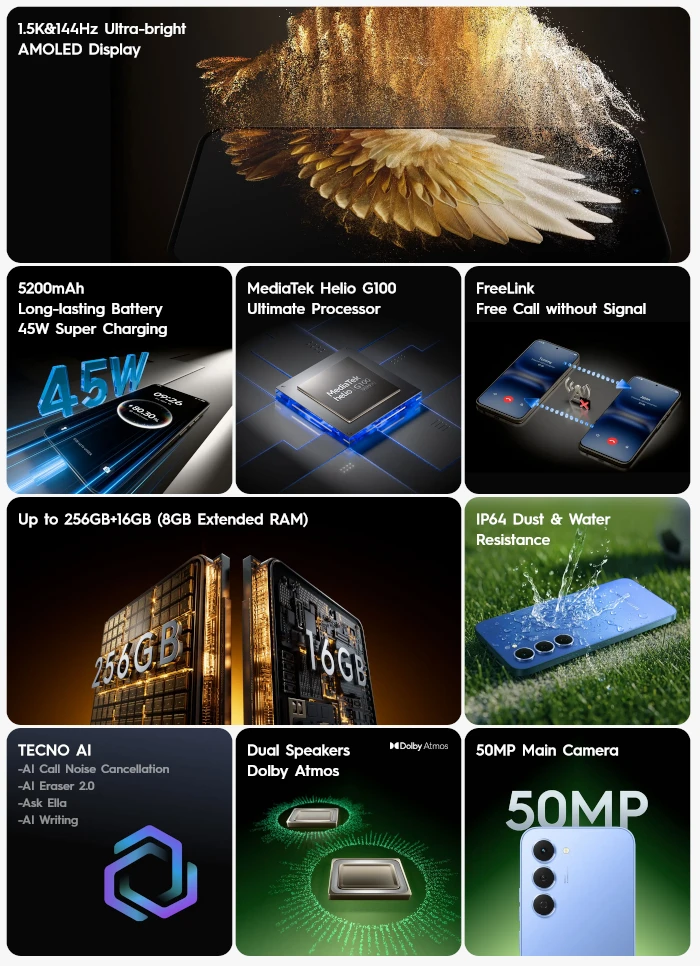 TECNO SPARK 40 Pro 海外で発表。144Hz駆動の有機ELディスプレイや45W急速充電対応の5200mAhバッテリー、MediaTek Helio G100 Ultimateを備え、防水防塵や指紋・顔認証にも対応のミッドレンジ4Gスマートフォンです。アフリカなどで発売。