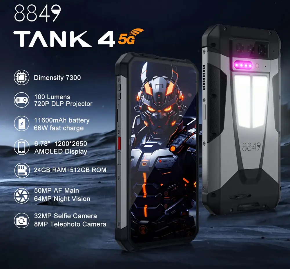 Unihertz Tank 4 (8849 Tank 4) は、6.78インチ(2650×1200)ディスプレイ、CPUはMediaTek Dimensity 7300 2.5GHz オクタコア、RAM12GB、ストレージ容量は512GB、メインカメラは5000万画素+6400万画素+800万画素トリプルカメラ搭載のミッドレンジクラスのアンドロイドスマートフォンです。