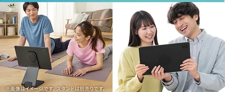 14インチの大型ディスプレイやクアッドスピーカーなどが特徴のモデルです。OSはAndroid 14、バッテリー容量は8000mAh、本体重量は985グラムです。また、別売りのスタンドも用意されています。