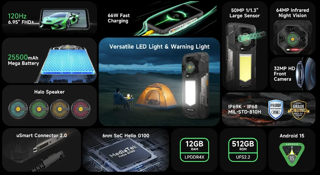 66W充電対応の25500mAh大容量バッテリー、防水防塵・耐衝撃対応(IP68/IP69K,MIL-STD-810H)対応、大型センサー採用のカメラ、4W大型スピーカー、リフレッシュレート120Hzディスプレイが特長です。生体認証は指紋認証センサー(サイド)と顔認証に対応、OSはAndroid 15、イヤホン端子はあり、接続端子はUSB Type-Cです。