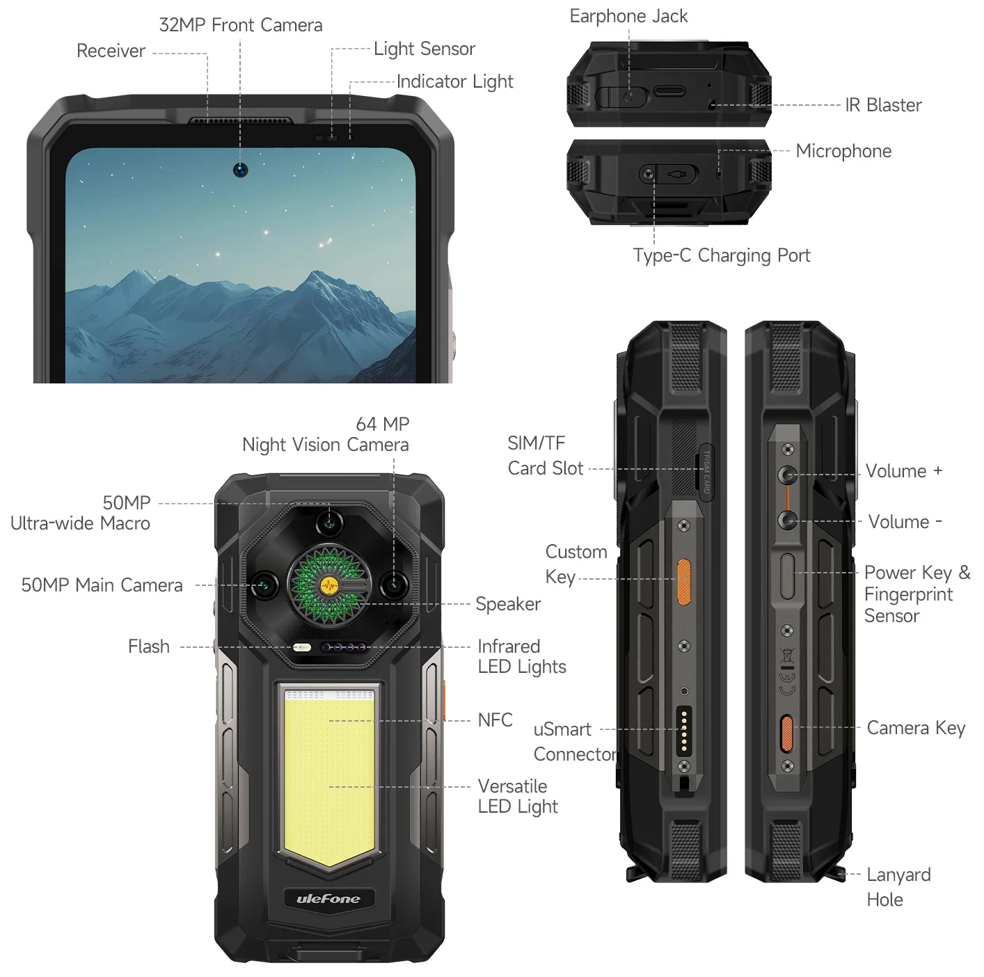 Ulefone Armor 33 は、6.95インチFHD+(2460×1080)ディスプレイ、CPUはMediaTek Helio G100 2.2GHz オクタコア、RAM12GB、ストレージ容量は512GB、カメラは5000万画素+6400万画素+5000万画素トリプルカメラ搭載のミッドレンジクラスのアンドロイドスマートフォンです。