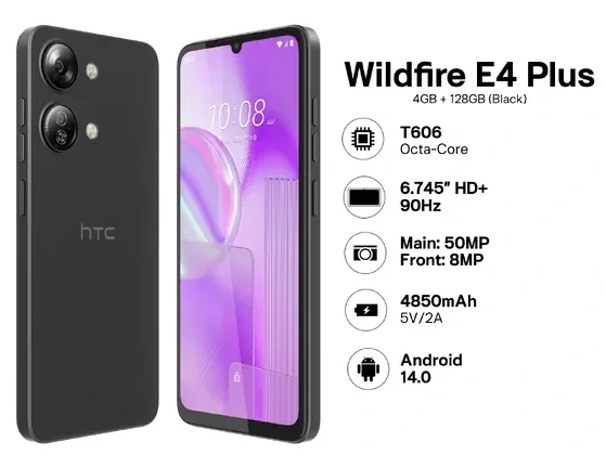 HTC Wildfire E4 Plus は、6.745インチHD+(1600×720)ディスプレイ、CPUはUNISOC T606 1.6Ghz オクタコア、RAM4GB、ストレージ容量は128GB、メインカメラは5000万画素+30万画素デュアルカメラ搭載でエントリークラスのアンドロイドスマートフォンとなっています。