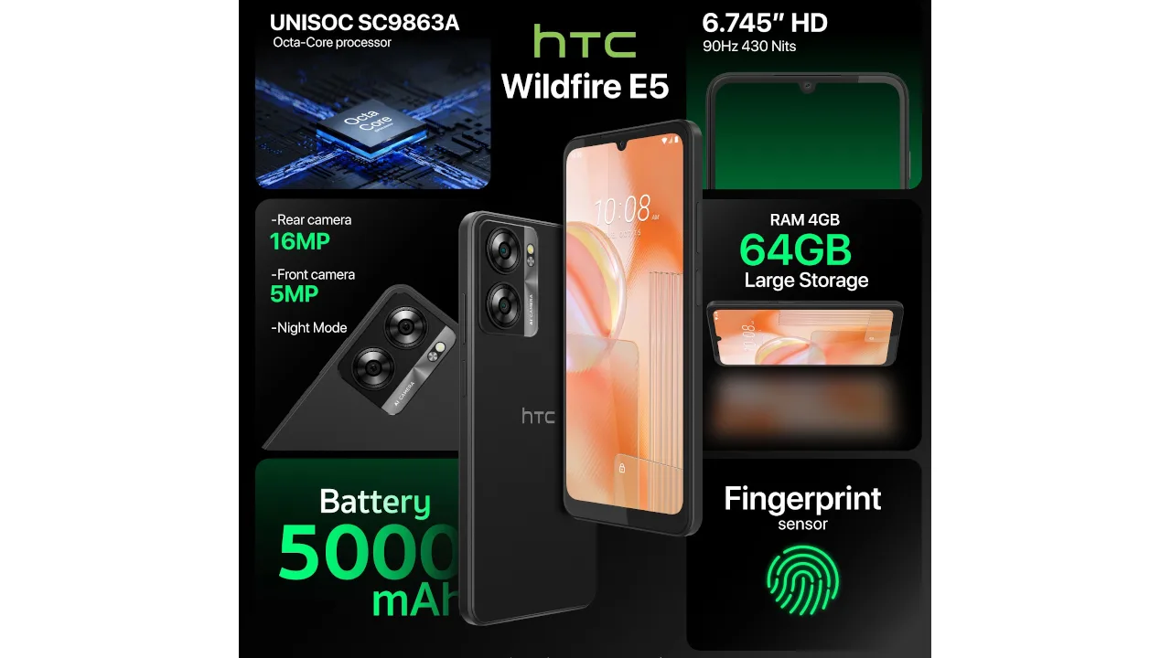 HTC Wildfire E5は6.75型90HzディスプレイとUNISOC SC9863A搭載のローエンド4Gスマホ。5000mAhバッテリーやデュアルカメラを備える低価格モデル。タイで発売、価格は2999バーツ(約1.4万円)。
