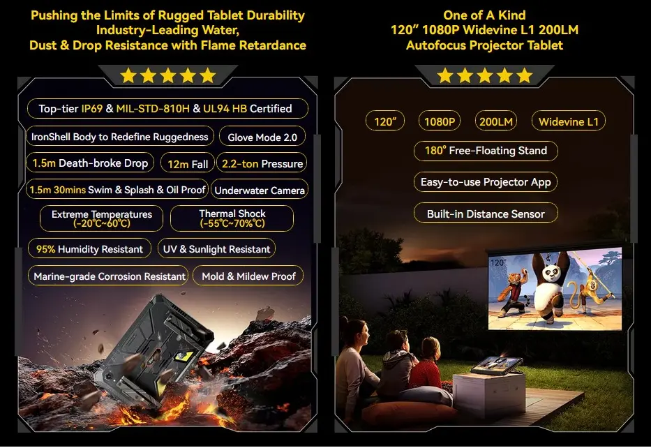 Blackview Active 12 Proは11型WUXGA液晶と200LMプロジェクター、30000mAhバッテリーを搭載した5G対応タフネスタブレット。IP69K防水防塵やMIL-STD-810H耐衝撃に対応。
