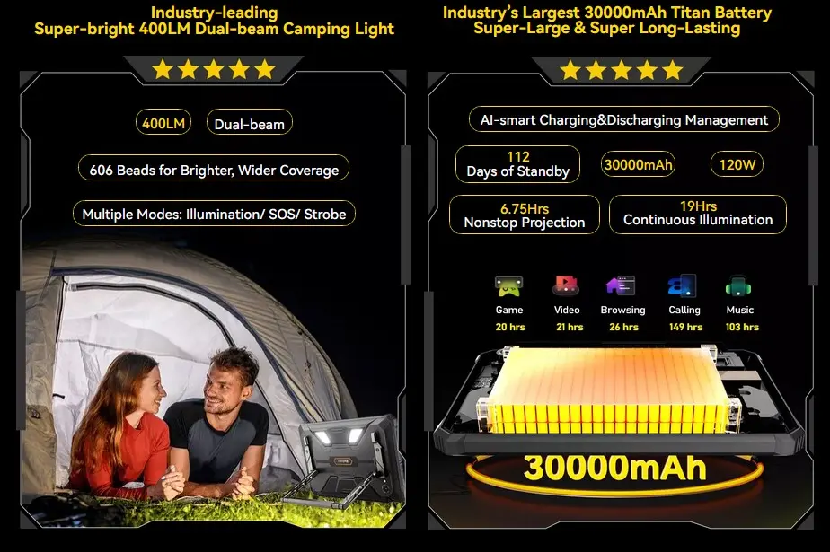 200LMのプロジェクター内蔵、30000mAh大容量バッテリー、防水防塵(IP68/IP69K)耐衝撃(MIL-STD-810H)、5G通信対応などが特徴のモデルです。OSはAndroid 15、LEDライト、デュアルスピーカー、接続端子はUSB Type-Cです。