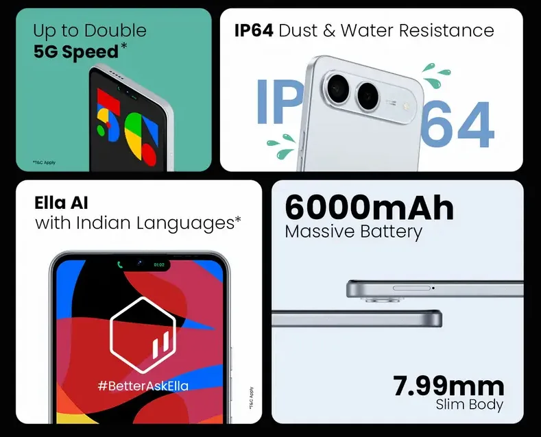 カラーはSky Blue , Ink Black , Turauoise Greenの3色。海外で2025年8月に発売、インドでの価格はRAM4GB/128GB 9,999INR(約1.7万円)となっています。
