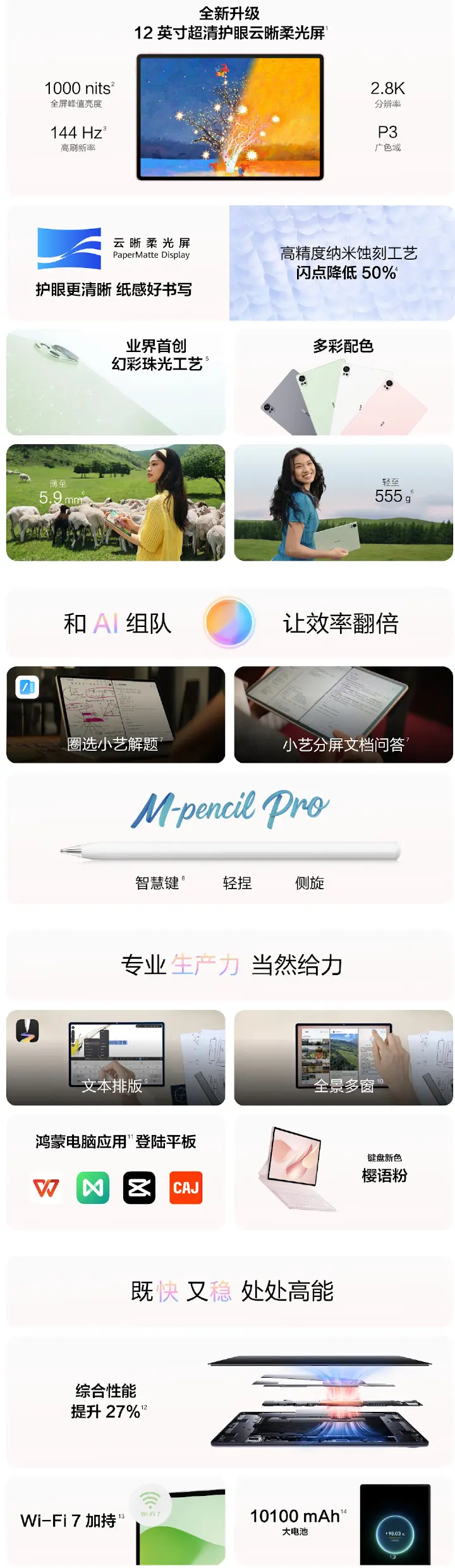 アスペクト比3:2でリフレッシュレート144Hzの高解像度ディスプレイ(ペーパーライクな柔光版もあり)やOSにHuawei(ファーウェイ)独自の「HarmonyOS 5.0」などが特徴のモデルです。