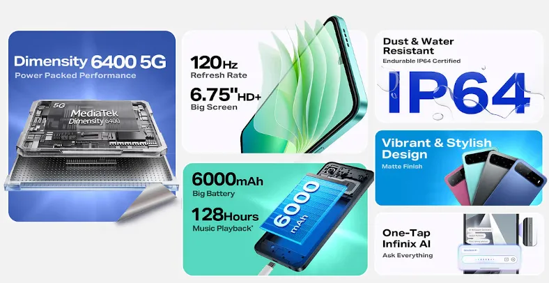 Infinix HOT 60i 5GはDimensity 6400搭載、6.75型120Hz画面や6000mAh電池を備える低価格5Gスマホ。45W急速充電や防塵防水対応、インドで発売、価格は9299INR(約1.6万円)。