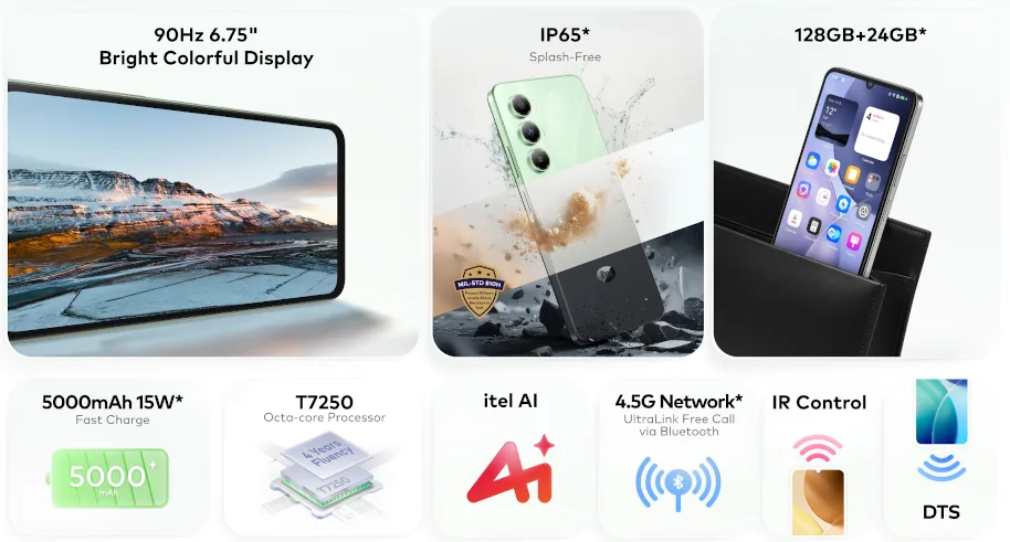 itel A100はUNISOC T7250搭載のAndroid Go Editionスマホ。6.75型90Hz画面や5000mAh電池を備え、IP65防水防塵対応の廉価モデルです。海外で発売。