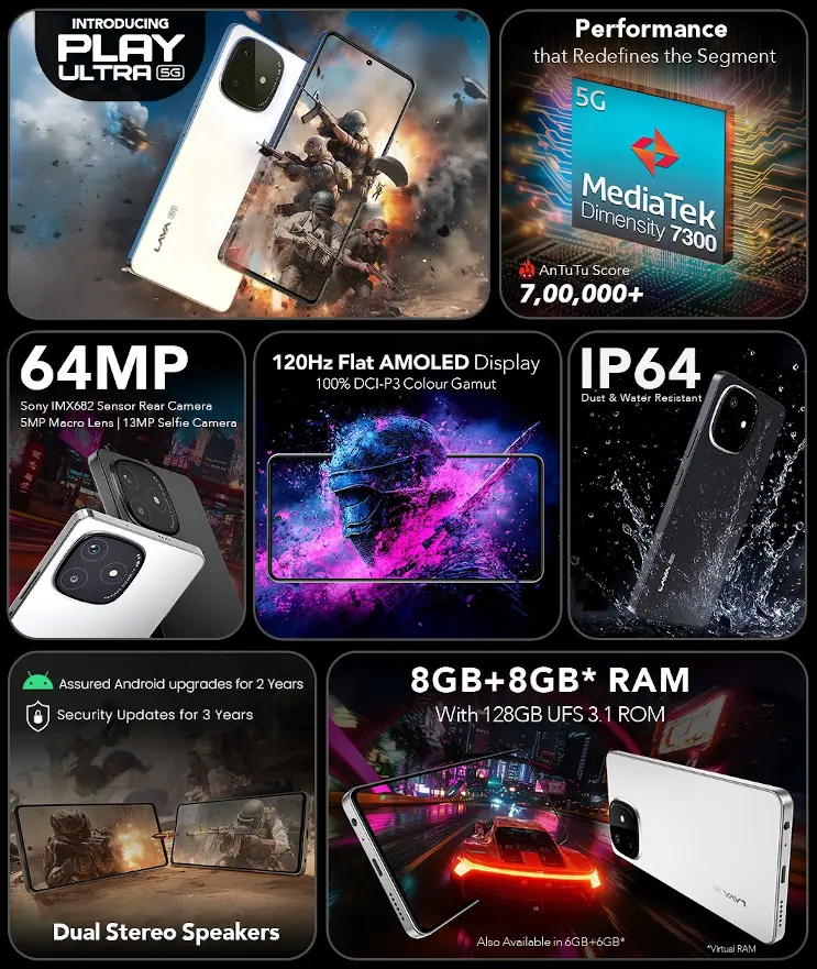 Lava Play Ultra は、6.67インチHD+(2400×1080)ディスプレイ、CPUはMediaTek Dimensity 7300 2.5GHz オクタコア、RAM6GB/8GB、ストレージは128GB、メインカメラは6400万画素デュアルカメラ搭載のミッドレンジクラスのアンドロイドスマートフォンです。