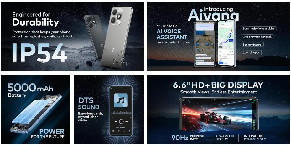 カラーはStarlit Black , Space Titanium , Aurora Blueの3色展開。インドで2025年8月に発売、価格はRAM3GB/64GB 5,999INR(約1.0万円)、RAM4GB/128GB 6,899INR(約1.2万円)となっています。