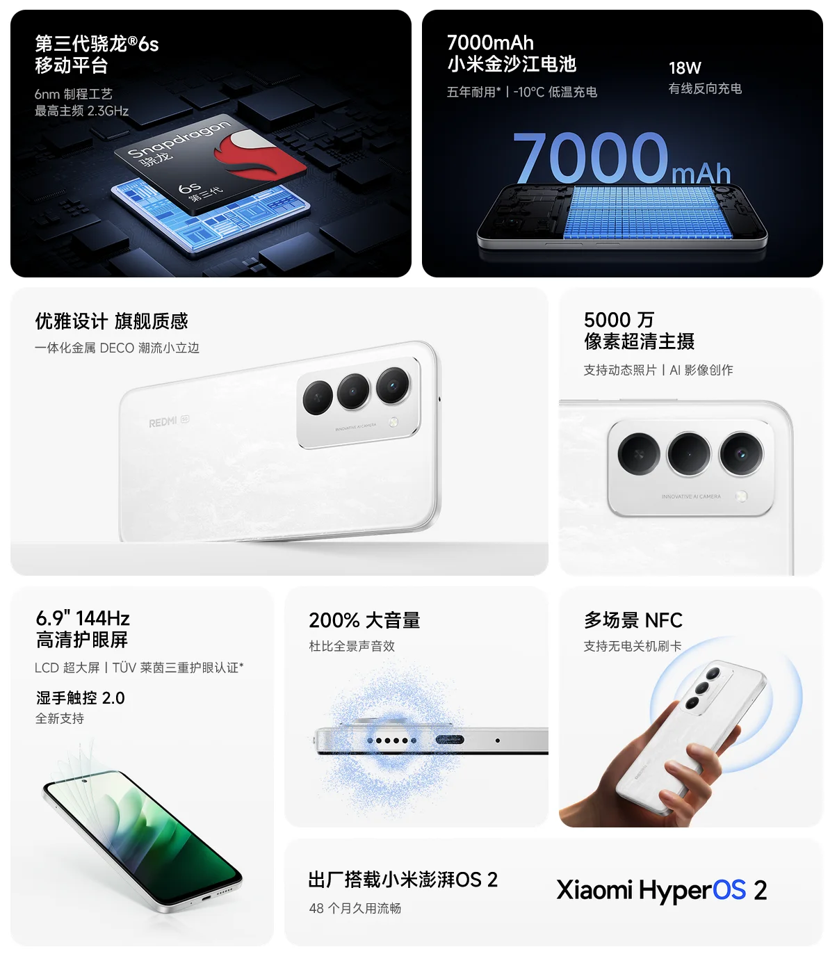 REDMI Note 15R は Snapdragon 6s Gen 3・6.9型144Hzディスプレイ・7000mAh大容量電池搭載。防水防塵対応で5Gスマホとして中国で発売。価格は1499元(約3.1万円)から