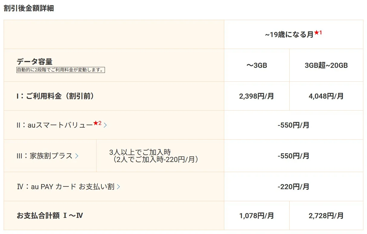 ・月額料金は~3GBが2,398円・~20GBが4,048円、各種割引適用後は~3GBが1,078円・~20GBが2,728円
