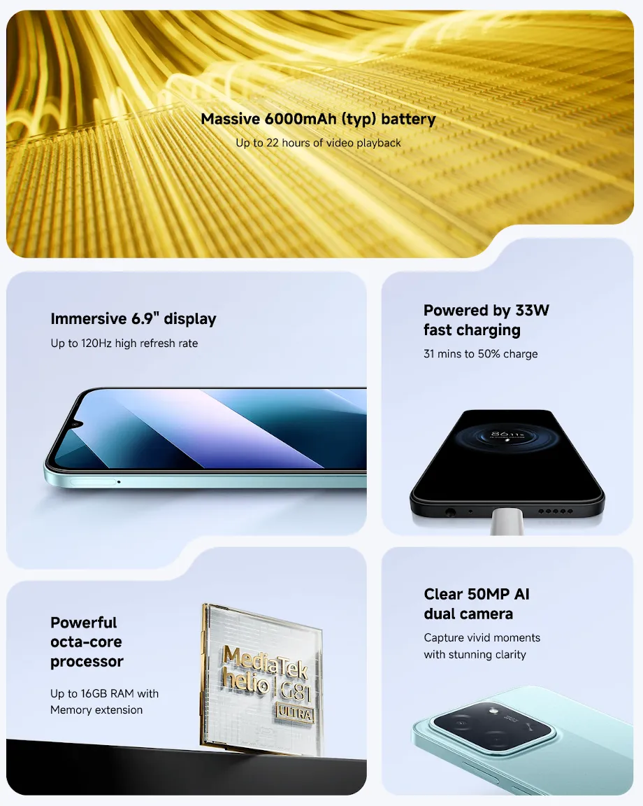 Xiaomi POCO C85 は Helio G81-Ultra 搭載の6.9型スマホ。120Hz対応大画面や6000mAh電池(33W急速充電)を備えた廉価モデルです。