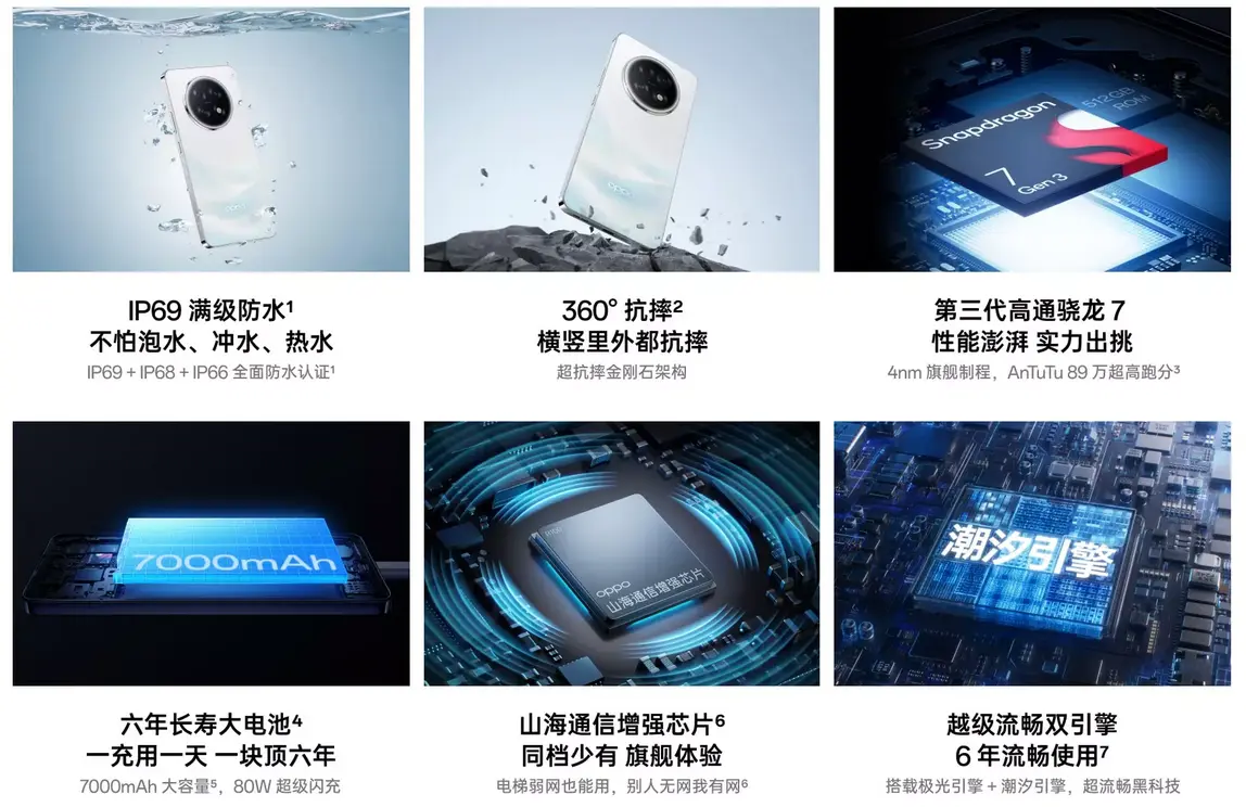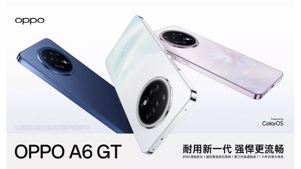 OPPO A6 GT は Snapdragon 7 Gen 3 搭載の5Gスマホ。6.8型120Hz AMOLED大画面や7000mAh電池(80W急速充電)、防水防塵対応。中国で発売、価格は1699CNY(約3.6万円)から