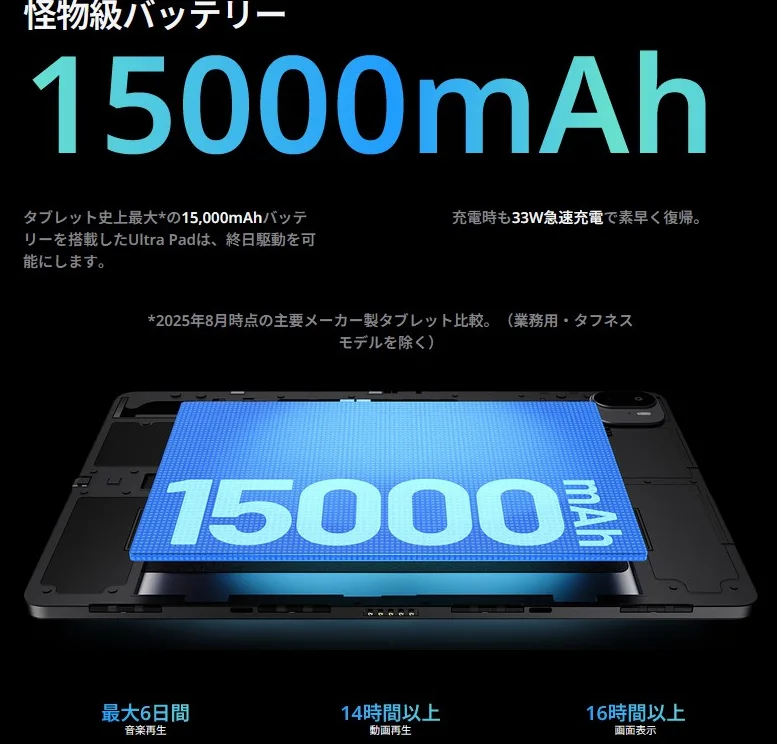バッテリー : 15000mAh(急速充電対応 33W)