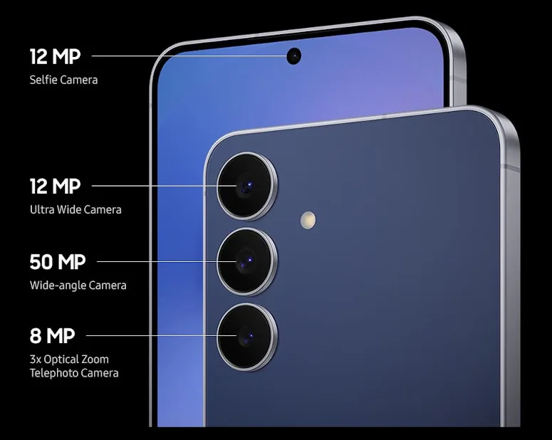 リフレッシュレート120Hzの有機ELディスプレイやOIS付トリプルカメラ、防水防塵対応、Galaxy AIなどが特長のモデルです。OSはAndroid 16 (One UI 8.0)、5G対応、ワイヤレス充電/給電対応、指紋認証センサーは画面内、イヤホン端子はなし、接続端子はUSB Type-Cとなっています。