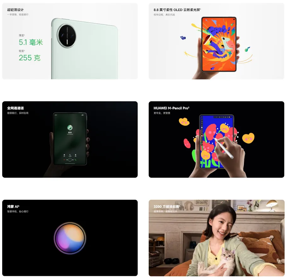 高解像度な有機ELディスプレイやタブレットとしては非常に軽量な255グラム、音声通話可能、OSにHuawei(ファーウェイ)独自の「HarmonyOS 5.1」などが特徴のモデルです。
