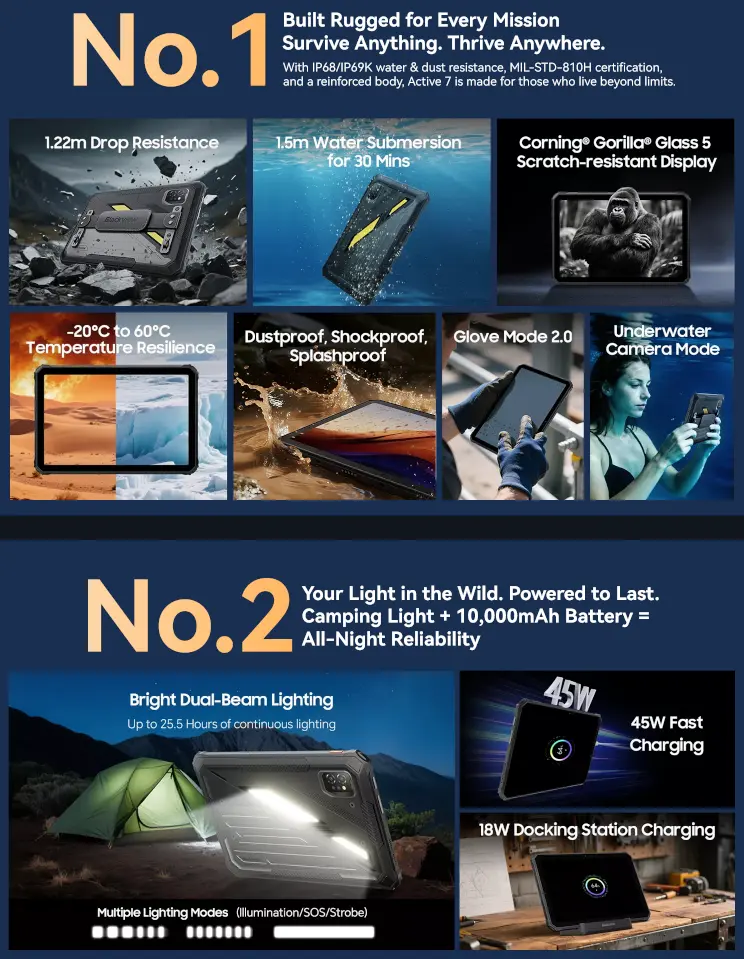 Blackview Active 7はMediaTek Helio G81を搭載した11インチタフネスAndroidタブレット。防水防塵・耐衝撃対応で、Night Visionカメラ、10000mAhバッテリー(45W急速充電)、4G LTE通信対応。