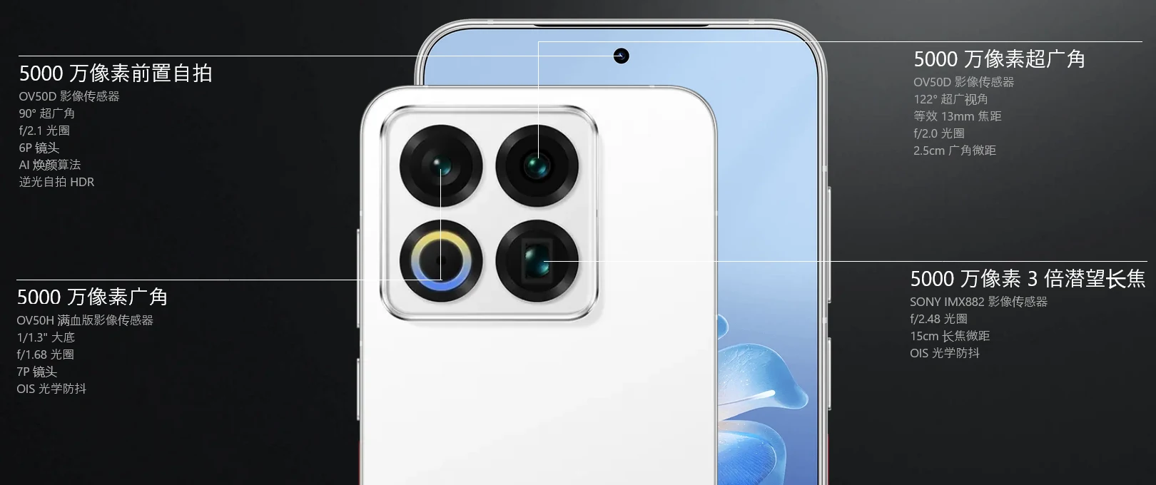 メインカメラ : 5000万画素(メイン OV50H 24mm F1.68 OIS)+5000万画素(広角 OV50D 13mm F2.05)+500万画素(ペリスコープ望遠3x IMX882 72mm F2.48 OIS)トリプルカメラ