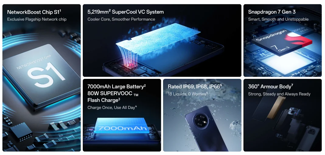 急速充電対応80W対応の7000mAhバッテリーやリフレッシュレート120HzのAMOLEDディスプレイ、OIS付デュアルカメラ、防水防塵耐衝撃対応などが特徴です。