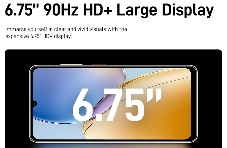 ディスプレイ : 6.75インチ HD+ 1600×720 20:9 , 90Hz , IPS