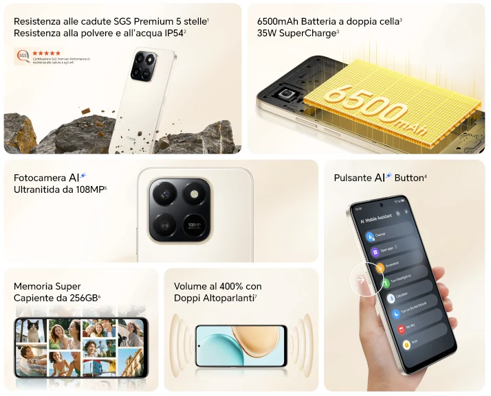大容量6500mAhバッテリーや防水防塵耐衝撃対応、リフレッシュレート120Hzディスプレイなどが特徴のモデルです。OSはAndroid 15 (MagicOS 9.0)、ステレオスピーカー、イヤホン端子はなし、接続端子はUSB Type-Cです。