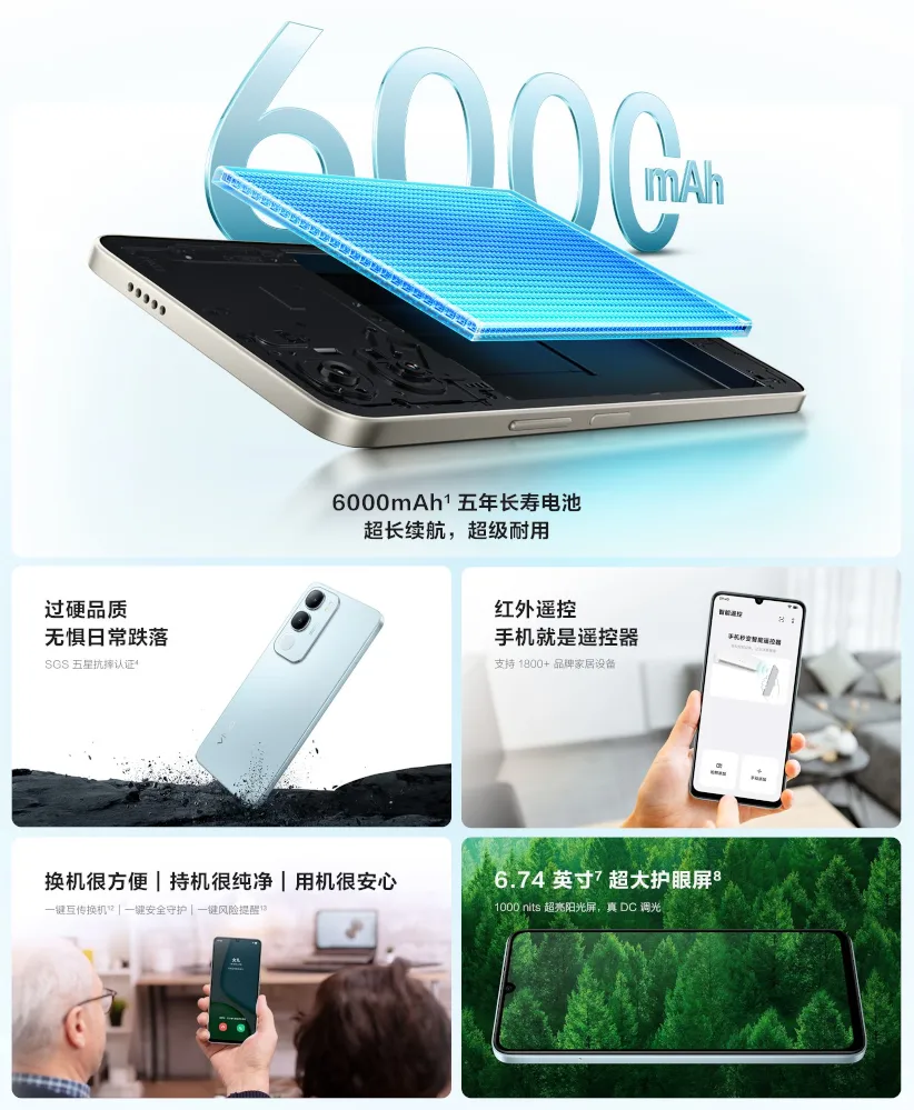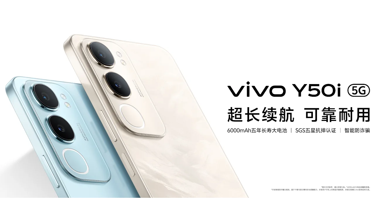 vivo Y50i は、MediaTek Dimensity 6300搭載、6.74インチHD+ディスプレイ、6000mAhバッテリー、防水防塵(IP64)に対応した5Gスマートフォンです。中国で発売、価格は1499元(約3.2万円)。