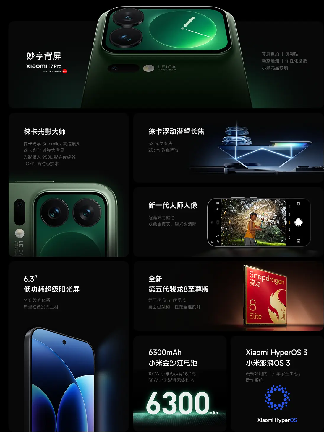 Xiaomi 17 ProはSnapdragon 8 Elite Gen 5搭載の6.3インチハイスペックスマホ。Leicaトリプルカメラ、2.7インチリアディスプレイ、6300mAhバッテリー(100W急速充電)、防水防塵対応。中国で発売、価格は4999元(約10.6万円)から。