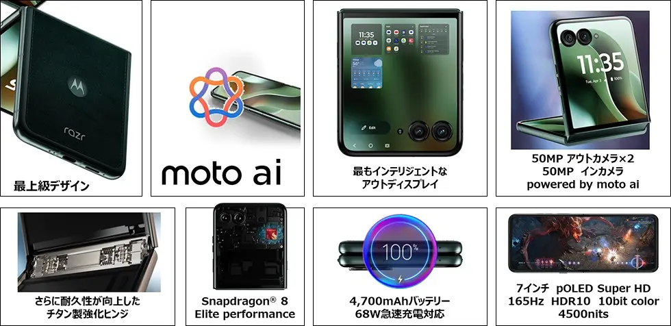 カラーはPANTONE Scarab(スカラベグリーン)の1色。2025年12月に発売予定、販売価格は未定です。MOTO STORE・国内各種オンラインショップ・全国主要家電量販店・IIJmioの他、auからも発売します。また、ミッドレンジモデルのmotorola razr 60も同時に発表しています。