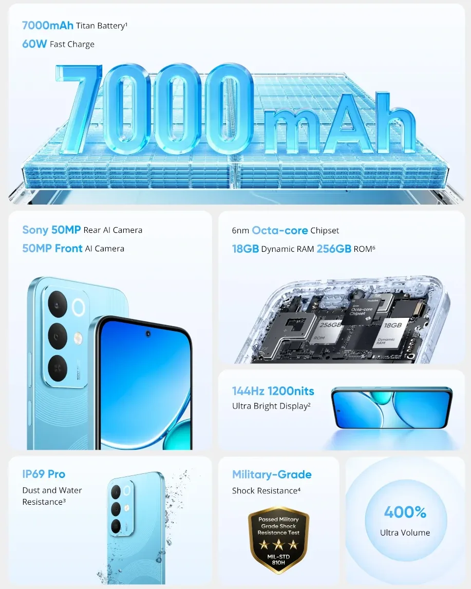 カラーはAqua Blue , Marine Blue , Maroon Redの3色。インドで2025年10月に発売、価格はRAM6GB/128GBモデルが16,999INR(約2.9万円)、RAM8GB/128GBモデルが17,999INR(約3.0万円)となっています。
