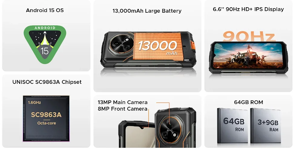 DOOGEE Fire 5は、UNISOC SC9863Aを搭載したタフネス仕様の4Gスマホ。6.56インチHD+ディスプレイ、13000mAhの大容量バッテリーを搭載。防水防塵・耐衝撃対応(IP68/IP69K、MIL-STD-810H)。海外で発売。